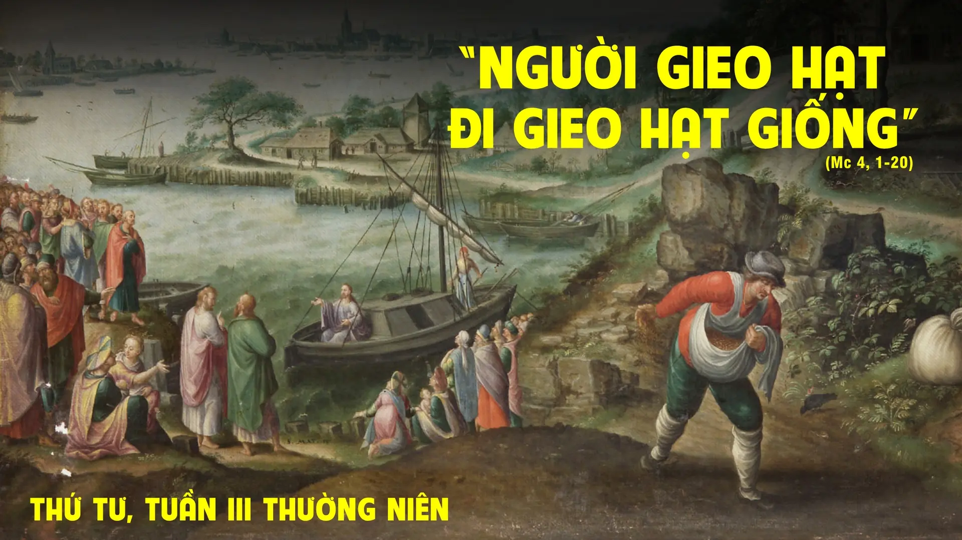 Khi ấy, Chúa Giêsu bắt đầu giảng dạy ở bờ biển và có đám đông dân chúng tụ lại gần Người, nên Người xuống ngồi trong một chiếc thuyền trên mặt biển, tất cả đám đông thì ở trên đất theo dọc bờ biển. Người dùng dụ ngôn mà dạy họ nhiều điều, và khi giảng, Người nói với họ rằng: “Các ngươi hãy nghe! Nầy người gieo hạt đi gieo hạt giống. Khi gieo, một phần hạt rơi xuống vệ đường và chim trời đến ăn hết. Phần khác rơi trên đất sỏi, nơi không có nhiều đất. Hạt giống đã mọc lên ngay, vì lớp đất không sâu. Nhưng khi mặt trời mọc lên, hạt giống bị nắng đốt và vì không rễ, nên bị chết khô. Một phần khác rơi vào bụi gai và gai mọc lên làm hạt giống chết mà không sinh hoa trái được. Phần hạt khác rơi vào đất tốt, mọc lên, nẩy nở và sinh quả, hạt thì sinh được ba mươi, hạt được sáu mươi, hạt được một trăm”. Và Người phán rằng: “Ai có tai nghe thì hãy nghe”. Khi Người còn lại một mình, thì mười hai ông là những kẻ luôn ở với Người, hỏi Người về ý nghĩa dụ ngôn, Người liền bảo các ông: “Các con được ơn biết mầu nhiệm về nước Thiên Chúa, còn những người khác ở ngoài thì mọi sự được giảng dạy bằng dụ ngôn, vì chúng nhìn mà không thấy, nghe mà không hiểu, kẻo chúng trở lại mà được tha tội”. Người nói với các ông: “Các con không hiểu dụ ngôn đó sao? Vậy thì hiểu sao được tất cả những dụ ngôn khác? Người gieo hạt là gieo lời Chúa. Vệ đường mà lời Chúa được gieo vào, là những kẻ vừa nghe xong, thì Satan đến và cất lấy lời Chúa gieo trong tâm hồn họ. Và cũng thế, những hạt giống rơi trên đất sỏi, là những kẻ khi nghe lời Chúa thì đón nhận vui vẻ, nhưng chúng không đâm rễ bên trong và là những người hay thay đổi: sau đó gặp phải cơ cực hay bắt bớ vì lời Chúa, thì họ sa ngã liền. Lại có những hạt giống rơi trong bụi gai. Đây là những kẻ nghe lời Chúa, nhưng những lo lắng trần tục, bóp nghẹt lời Chúa, khiến không thể sinh hoa trái được. Còn những hạt giống gieo trong đất tốt: đó là những người nghe lời Chúa, biết giữ lấy và làm sinh lợi, hạt ba mươi, hạt sáu mươi và hạt một trăm”.