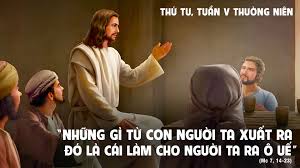 1. Chúa Giêsu đã nói : không phải cái từ bên ngoài có thể làm cho người ta ra ô uế, mà chính là những cái phát xuất từ bên trong, từ lòng của con người như tham lam, tà dân, giết người, trộm cắp, độc ác, xảo trá, ganh tị… Chính những cái đó mới làm cho người ta ra xấu xa ô uế.