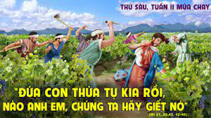 Khi ấy, Chúa Giêsu phán cùng các thượng tế và các kỳ lão trong dân rằng: “Các ông hãy nghe dụ ngôn này: Có ông chủ nhà kia trồng được một vườn nho. Ông rào dậu chung quanh, đào hầm ép rượu và xây tháp canh; đoạn ông cho tá điền thuê, rồi đi phương xa. Ðến mùa nho, ông sai đầy tớ đến nhà tá điền để thu phần hoa lợi. Nhưng những người làm vườn nho bắt các đầy tớ ông: đánh đứa này, giết đứa kia và ném đá đứa khác. Chủ lại sai một số đầy tớ khác đông hơn trước, nhưng họ cũng xử với chúng như vậy. Sau cùng chủ sai chính con trai mình đến với họ, vì nghĩ rằng: Họ sẽ kính nể con trai mình. Nhưng bọn làm vườn vừa thấy con trai ông chủ liền bảo nhau: “Ðứa con thừa tự kia rồi: Nào anh em! Chúng ta hãy giết nó đi và chiếm lấy gia tài của nó”. Rồi họ bắt cậu, lôi ra khỏi vườn nho mà giết. Vậy khi chủ về, ông sẽ xử trí với bọn họ thế nào? Các ông trả lời: “Ông sẽ tru diệt bọn hung ác đó và sẽ cho người khác thuê vườn nho để cứ mùa nộp phần hoa lợi”. Chúa Giêsu phán: “Các ông chưa bao giờ đọc thấy trong Kinh Thánh sao: “Chính viên đá bọn thợ loại ra, đã trở nên viên đá góc; đó là việc Chúa làm và là việc lạ lùng trước mắt chúng ta?” Bởi vậy, Ta bảo các ông: Nước Thiên Chúa sẽ cất khỏi các ông để trao cho dân tộc khác biết làm cho trổ sinh hoa trái”. Các Thượng tế và biệt phái nghe dụ ngôn đó, thì hiểu Người ám chỉ về mình. Họ liền tìm cách bắt Người, nhưng lại sợ dân chúng, vì thiên hạ đều tôn Người là Tiên tri.