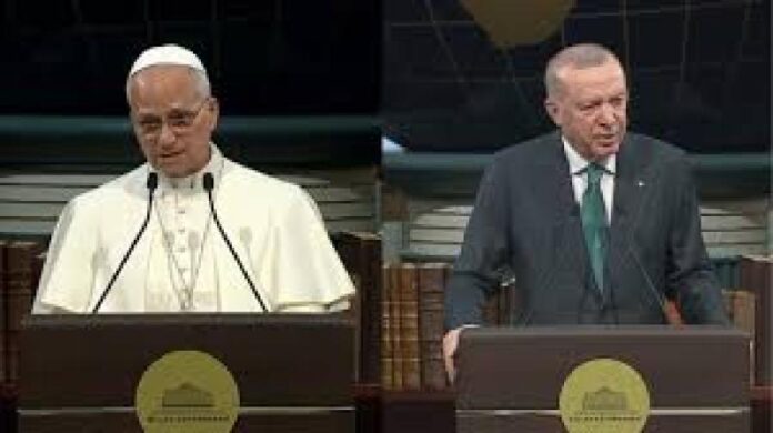 Thưa Tổng thống, cầu mong Thổ Nhĩ Kỳ là nguồn ổn định và xích lại gần nhau giữa các dân tộc, hướng tới một nền hòa bình công bằng và lâu dài. Chuyến thăm Thổ Nhĩ Kỳ của bốn vị Giáo hoàng – Đức Phaolô VI năm 1967, Đức Gioan Phaolô II năm 1979, Đức Bênêđictô XVI năm 2006 và Đức Phanxicô năm 2014 – cho thấy Tòa Thánh không chỉ duy trì mối quan hệ tốt đẹp với Cộng hòa Thổ Nhĩ Kỳ mà còn mong muốn hợp tác xây dựng một thế giới tốt đẹp hơn với sự đóng góp của quốc gia này, một cầu nối giữa Đông và Tây, giữa Á và Âu, và là ngã tư của những nền văn hóa và tôn giáo. Chuyến thăm đặc biệt của tôi, nhân dịp kỷ niệm 1700 năm Công đồng Nicaea, cho chúng ta thấy về sự gặp gỡ và đối thoại, cũng như việc tám Công đồng chung đầu tiên được tổ chức trên vùng đất Thổ Nhĩ Kỳ ngày nay.