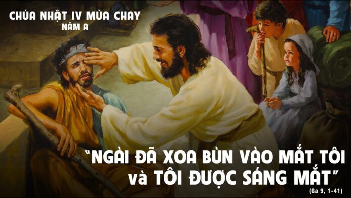 Khi ấy, Chúa Giêsu đi qua, thấy một người mù từ khi mới sinh. Môn đệ hỏi Người: “Thưa Thầy, ai đã phạm tội, anh này hay cha mẹ anh, khiến anh mù từ khi mới sinh?” Chúa Giêsu đáp: “Không phải anh cũng chẳng phải cha mẹ anh đã phạm tội, nhưng để công việc của Thiên Chúa tỏ ra nơi anh. Bao lâu còn ban ngày, Ta phải làm những việc của Ðấng đã sai Ta. Ðêm đến không ai có thể làm việc được nữa. Bao lâu Ta còn ở thế gian, Ta là sự sáng thế gian”. Nói xong, Người nhổ xuống đất, lấy nước miếng trộn thành bùn, rồi xoa bùn trên mắt người ấy và bảo: “Anh hãy đến hồ Silôê mà rửa” (chữ Silôê có nghĩa là được sai). Anh ta ra đi và rửa, rồi trở lại thì trông thấy được. Những người láng giềng và những kẻ xưa kia từng thấy anh ta ăn xin đều nói: “Ðó chẳng phải là người vẫn ngồi ăn xin sao?” Có kẻ nói: “Ðúng hắn!” Lại có người bảo: “Không phải, nhưng là một người giống hắn”. Còn anh ta thì nói: “Chính tôi đây”. Họ hỏi anh: “Làm thế nào mắt anh được sáng?” Anh ta nói: “Người mà thiên hạ gọi là Giêsu đã làm bùn xức mắt tôi và bảo: Ngươi hãy đến hồ Silôê mà rửa. Bấy giờ tôi đi, tôi rửa và tôi trông thấy”. Họ lại hỏi: “Ngài ở đâu?” Anh thưa: “Tôi không biết”. Họ liền dẫn người trước kia bị mù đến với những người biệt phái, lý do tại Chúa Giêsu hoà bùn và chữa mắt cho anh ta lại nhằm ngày Sabbat. Các người biệt phái cũng hỏi anh ta do đâu được sáng mắt? Anh đáp: “Ngài đã xoa bùn vào mắt tôi, tôi đi rửa và tôi được sáng mắt”. Mấy người biệt phái nói: “Người đó không phải bởi Thiên Chúa, vì không giữ ngày Sabbat”. Mấy kẻ khác lại rằng: “Làm sao một người tội lỗi lại làm được những phép lạ thể ấy?” Họ bất đồng ý kiến với nhau. Họ liền quay lại hỏi người mù lần nữa: “Còn anh, anh nói gì về người đã mở mắt cho anh?” Anh đáp: “Ðó là một tiên tri”. Nhưng người Do-thái không muốn tin anh đã mù và đã được khỏi trước khi đòi cha mẹ anh đến. Họ hỏi hai ông bà: “Người này có phải là con hai ông bà mà ông bà bảo bị mù từ khi mới sinh không? Do đâu mà bây giờ nó lại trông thấy?” Cha mẹ y thưa rằng: “Chúng tôi xác nhận đây chính là con chúng tôi, và nó đã bị mù từ khi mới sinh. Nhưng làm sao mà bây giờ nó trông thấy, và ai đã mở mắt cho nó thì chúng tôi không biết. Nó khôn lớn rồi, các ông hãy hỏi nó, nó sẽ tự thưa lấy”. Cha mẹ anh ta nói thế bởi sợ người Do-thái, vì người Do-thái đã bàn định trục xuất khỏi hội đường bất cứ ai dám công nhận Chúa Giêsu là Ðấng Kitô. Chính vì lý do này mà cha mẹ anh ta nói: “Nó khôn lớn rồi, xin các ông cứ hỏi nó”. Lúc ấy người Do-thái lại gọi người trước kia đã mù đến và bảo: “Anh hãy tôn vinh Thiên Chúa! Phần chúng ta, chúng ta biết người đó là một kẻ tội lỗi”. Anh ta trả lời: “Nếu đó là một người tội lỗi, tôi không biết; tôi chỉ biết một điều: trước đây tôi mù và bây giờ tôi trông thấy”. Họ hỏi anh: “Người đó đã làm gì cho anh? Người đó đã mở mắt anh thế nào?” Anh thưa: “Tôi đã nói và các ông đã nghe, các ông còn muốn nghe gì nữa? Hay là các ông cũng muốn làm môn đệ Ngài chăng?” Họ liền nguyền rủa anh ta và bảo: “Mày hãy làm môn đệ của người đó đi, còn chúng ta, chúng ta là môn đệ của Môsê. Chúng ta biết Thiên Chúa đã nói với Môsê, còn người đó chúng ta không biết bởi đâu mà đến”. Anh đáp: “Ðó mới thật là điều lạ: người đó đã mở mắt cho tôi, thế mà các ông không biết người đó bởi đâu. Nhưng chúng ta biết rằng Thiên Chúa không nghe lời những kẻ tội lỗi, mà hễ ai kính sợ Thiên Chúa và làm theo ý Chúa, thì kẻ đó mới được Chúa nghe lời. Xưa nay chưa từng nghe nói có ai đã mở mắt người mù từ khi mới sinh. Nếu người đó không bởi Thiên Chúa thì đã không làm được gì”. Họ bảo anh ta: “Mày sinh ra trong tội mà mày dám dạy chúng ta ư?” Rồi họ đuổi anh ta ra ngoài. Chúa Giêsu hay tin họ đuổi anh ta ra ngoài, nên khi gặp anh, Người liền bảo: “Anh có tin Con Thiên Chúa không?” Anh thưa: “Thưa Ngài, nhưng Người là ai để tôi tin Người?” Chúa Giêsu đáp: “Anh đang nhìn thấy Người và chính Người đang nói với anh”. Anh ta liền nói: “Lạy Ngài, tôi tin”, và anh ta sấp mình thờ lạy Người. Chúa Giêsu liền nói: “Chính vì để luận xét mà Ta đã đến thế gian hầu những kẻ không xem thấy, thì được xem thấy, và những kẻ xem thấy, sẽ trở nên mù”. Những người biệt phái có mặt ở đó liền nói với Người: “Thế ra chúng tôi mù cả ư?” Chúa Giêsu đáp: “Nếu các ngươi mù, thì các ngươi đã không mắc tội; nhưng các ngươi nói “Chúng tôi xem thấy”, nên tội các ngươi vẫn còn”.