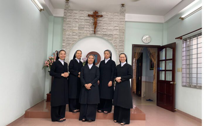 Cộng đoàn toạ lạc gần khu chợ sầm uất; và khi nói đến chợ, ta thường liên tưởng tới tiếng ồn. Tuy nhiên, khi bước vào con hẻm nhỏ, ta lại cảm thấy một không gian khác, khá yên tĩnh. Vì vậy, đây quả là một nơi khá lý tưởng cho các nữ tu sống và hoạt động giữa lòng Thành Phố Sài Gòn sôi động.Khu đất của cộng đoàn trước đây là của gia đình Ông Bà cố Hoàng, song thân của Soeur Thược. Sau khi định cư bên Mỹ, Ông Bà Cố và gia đình dâng cho Hội Dòng. Sau đó Hội Dòng xây dựng lại và lấy tên là Cộng đoàn “Đức Mẹ Cát Minh”. Ngày 31/06/2005, Hội dòng chính thức cử một số chị em về phục vụ. “Vạn sự khởi đầu nan”, các chị đã gặp không ít khó khăn. Nhưng tạ ơn Chúa, các chị vẫn cố gắng mỗi ngày để vừa ổn định cuộc sống, vừa cộng tác trong công việc mục vụ tại giáo xứ