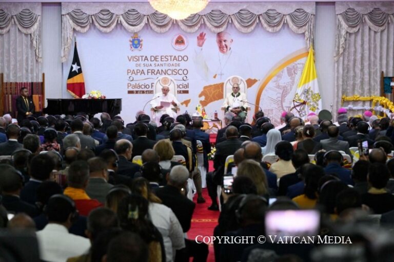 “Học thuyết xã hội của Giáo hội Công giáo không phải là một ý thức hệ, nó dựa trên tình huynh đệ”. Trong bài phát biểu trước các nhà chức trách, xã hội dân sự và ngoại giao đoàn, Đức Thánh Cha Phanxicô nhấn mạnh sự cần thiết của Đông Timor phải dựa vào những giáo huấn của Giáo hội, “một trụ cột không thể thiếu cho sự phát triển toàn diện”.