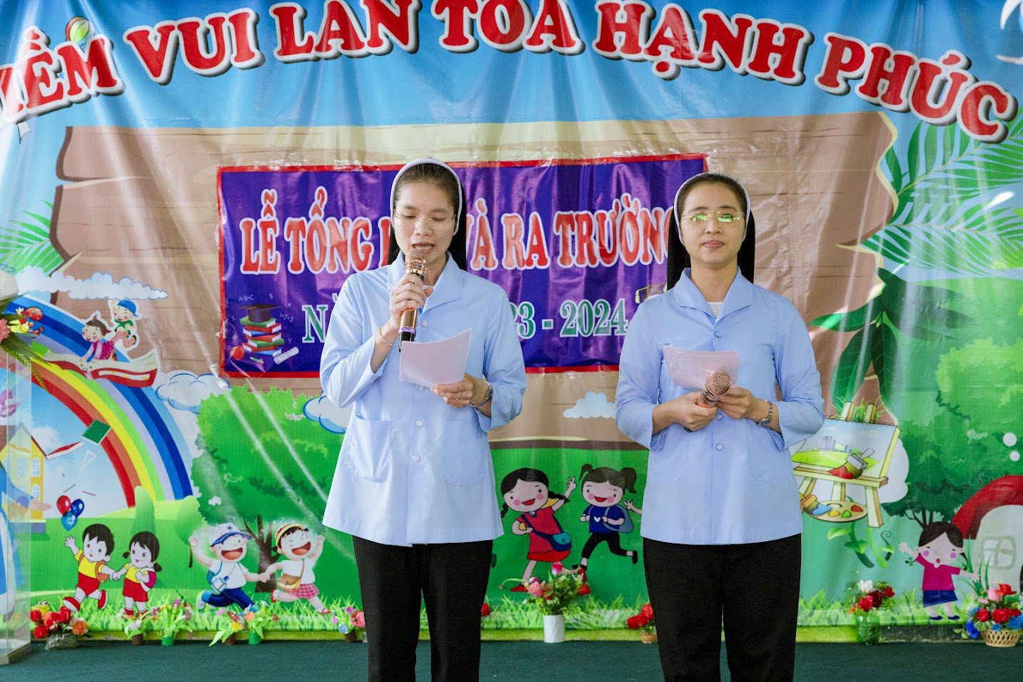 Mới đó mà năm học đã trôi qua. Nhớ ngày nào chúng em bước về cộng đoàn, mọi sự đều mới lạ, từ Ban Giám Hiệu đến các Giáo Viên, các em học sinh, cô và trò đều mới mẻ, lạ lẫm… Thoáng thời gian trôi thật nhanh, hôm nay đã đến ngày tổng kết ra trường của các bé.
