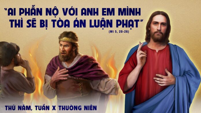 Khi ấy, Đức Giêsu nói với các môn đệ rằng: “Thầy bảo cho anh em biết, nếu anh em không ăn ở công chính hơn các kinh sư và người Pharisêu, thì sẽ chẳng được vào Nước Trời. Anh em đã nghe Luật dạy người xưa rằng: Chớ giết người. Ai giết người, thì đáng bị đưa ra tòa. Còn Thầy, Thầy bảo cho anh em biết: ai giận anh em mình, thì phải bị đưa ra tòa. Ai mắng anh em mình là đồ ngốc, thì phải bị đưa ra trước thượng hội đồng. Còn ai chửi anh em mình là quân phản đạo, thì phải bị lửa hỏa ngục thiêu đốt. Vậy, nếu khi anh sắp dâng lễ vật trước bàn thờ, mà sực nhớ có người anh em đang có chuyện bất bình với anh, thì hãy để của lễ lại đó trước bàn thờ, đi làm hòa với người anh em ấy đã, rồi trở lại dâng lễ vật của mình. Anh hãy mau mau dàn xếp với đối phương, khi còn đang trên đường đi với người ấy tới cửa công, kẻo người ấy nộp anh cho quan tòa, quan tòa lại giao anh cho thuộc hạ, và anh sẽ bị tống ngục. Thầy bảo thật cho anh biết: anh sẽ không ra khỏi đó, trước khi trả hết đồng xu cuối cùng.”
