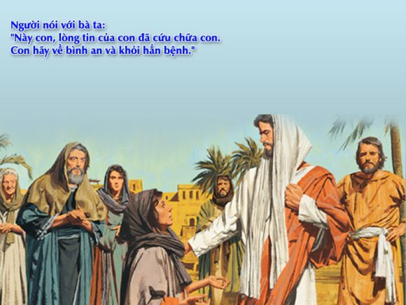 Lập tức, huyết cầm lại và bà cảm thấy trong mình đã được khỏi bệnh. Ngay lúc ấy, Chúa Giêsu nhận biết có sức mạnh đã xuất phát tự mình, Người liền quay lại đám đông mà hỏi: “Ai đã chạm đến áo Ta?” Các môn đệ thưa Người rằng: “Thầy coi, đám đông chen lấn Thầy tứ phía, vậy mà Thầy còn hỏi ‘Ai chạm đến Ta?’!” Nhưng Người cứ nhìn quanh để tìm xem kẻ đã làm điều đó. Bấy giờ người đàn bà run sợ, vì biết rõ sự thể đã xảy ra nơi mình, liền đến sụp lạy Người và thú nhận với Người tất cả sự thật. Người bảo bà: “Hỡi con, đức tin của con đã chữa con, hãy về bình an và được khỏi bệnh”.