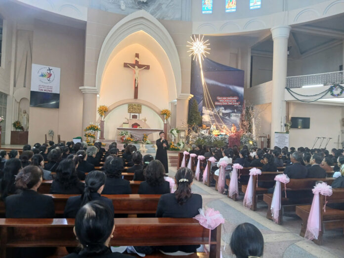 Những chiếc lá cuối thu còn sót lại, đang chênh chao nơi tiết trời lạnh lẽo, mù sương đặc quánh từng đợt của mùa đông, từng cơn gió nhẹ bao trùm lên mảnh đất tây nguyên, vẫn không hề phá vỡ bầu khí vui mừng của tuần bát nhật Giáng Sinh. Hôm nay ngày 28/ 12 /2025, hơn 160 hội viên Hiệp hội tín hữu Mến Thánh Giá của cụm Bảo Lộc, thuộc giáo xứ Bảo Lộc, giáo xứ Đại Lộc, giáo xứ Vinh Sơn Liêm, giáo xứ Tân Hà và giáo xứ Mẹ Thiên Chúa, quy tụ lại trước sảnh nhà thờ Bảo Lộc để hành hương trước ngày giáo phận cử hành thánh lễ bế mạc năm thánh hy vọng. Các hội viên bước vào nhà thờ miệng vang lên những ca từ quen thuộc “Tôi mừng vui mỗi khi nghe nhủ rằng, nào ta tiến lên đền thờ Thiên Chúa…”. Thánh đường giáo xứ Bảo Lộc lộng lẫy được tiếp thêm lửa ấm bởi những thành viên như thể ngọn đuốc sống đang lan toả… Cha Phêrô Đặng Văn Quý- cha phó giáo xứ Tân Hà bắt đầu giờ chia sẻ với cộng đoàn về chủ đề Tâm tình Năm Thánh Hy Vọng 2025- Hy Vọng không làm Thất Vọng. Ngài đã đặt ra câu hỏi cho mỗi người : Tại sao chúng ta có mặt ở đây? Hành hương là gì? Làm thế nào để hy vọng vào Chúa ? Có phải hết năm thánh hy vọng này thì mọi đau khổ, mọi khó khăn mọi vất vả sẽ kết thúc?