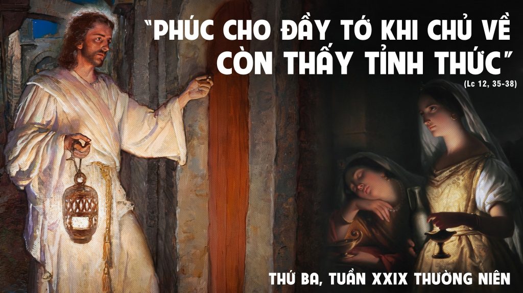 Khi ấy, Chúa Giêsu phán cùng các môn đệ rằng: “Các con hãy thắt lưng, hãy cầm đèn cháy sáng trong tay, và hãy làm như người đợi chủ đi ăn cưới về, để khi chủ về gõ cửa, thì mở ngay cho chủ. Phúc cho những đầy tớ nào khi chủ về còn thấy tỉnh thức. Thầy bảo thật các con, chủ sẽ thắt lưng, xếp chúng vào bàn ăn, và đi lại hầu hạ chúng. Nếu canh hai hoặc canh ba, chủ trở về mà gặp thấy như vậy, thì phúc cho các đầy tớ ấy”. Đó là lời Chúa.