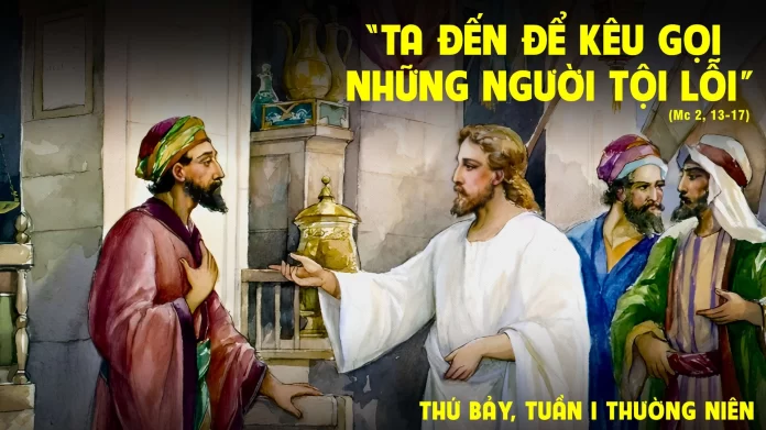 - Chúa Giêsu đi dọc bờ biển giảng dạy dân chúng. Người thấy ông Lêvi (Matthêu) đang ngồi thu thuế. Người gọi ông, ông liền theo Người, và dọn tiệc thiết đãi Người với các kẻ thu thuế và nhiều người tội lỗi. Thấy vậy, nhóm luật sĩ và biệt phái hỏi môn đệ Chúa : Sao Thầy các ông ăn uống với phường thu thuế và kẻ tội lỗi ? Chúa nghe thấy vậy thì đáp : Thầy thuốc không cần cho người khỏe mạnh mà chỉ cần cho kẻ yếu đau. Cũng thế, Ta không đến để kêu gọi người lành thánh mà đến để kêu gọi người tội lỗi ăn năn thống hối.
