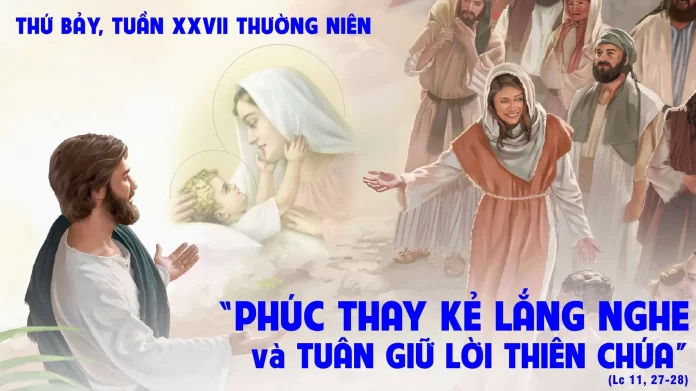 Khi ấy, Chúa Giêsu đang giảng cho dân chúng, thì từ giữa đám dân chúng, có một phụ nữ cất tiếng nói rằng: “Phúc cho dạ đã cưu mang Thầy và vú đã cho Thầy bú!” Nhưng Người phán rằng: “Những ai nghe và giữ lời Thiên Chúa thì có phúc hơn”.