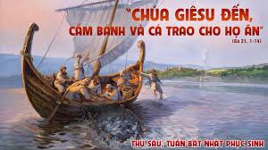 Khi ấy, lúc các môn đệ đang ở bờ biển Tibêria, Chúa Giêsu lại hiện đến. Công việc đã xảy ra như sau: Simon Phêrô, Tôma cũng gọi là Ðiđymô, Nathanael quê tại Cana xứ Galilêa, các con ông Giêbêđê, và hai môn đệ nữa đang ở với nhau. Simon Phêrô bảo: “Tôi đi đánh cá đây”. Các ông kia nói rằng: “Chúng tôi cùng đi với ông”. Mọi người ra đi xuống thuyền. Nhưng đêm ấy các ông không bắt được con cá nào. Lúc rạng đông, Chúa Giêsu hiện đến trên bờ biển, nhưng các môn đệ không biết là Chúa Giêsu. Người liền hỏi: “Này các con, có gì ăn không?” Họ đồng thanh đáp: “Thưa không”. Chúa Giêsu bảo: “Hãy thả lưới bên hữu thuyền thì sẽ được”. Các ông liền thả lưới và hầu không kéo nổi lưới lên, vì đầy cá. Người môn đệ Chúa Giêsu yêu, liền nói với Phêrô: “Chính Chúa đó”. Simon Phêrô nghe nói là Chúa, liền khoác áo vào, vì đang ở trần, rồi nhảy xuống biển. Các môn đệ khác chèo thuyền vào và kéo lưới đầy cá theo, vì không còn xa đất bao nhiêu, chỉ độ hai trăm thước tay. Khi các ông lên bờ, thấy có sẵn lửa than, trên để cá và bánh. Chúa Giêsu bảo: “Các con hãy mang cá mới bắt được lại đây”. Simon Phêrô xuống thuyền kéo lưới lên bờ. Lưới đầy toàn cá lớn; tất cả được một trăm năm mươi ba con. Dầu cá nhiều đến thế, nhưng lưới không rách. Chúa Giêsu bảo rằng: “Các con hãy lại ăn”. Không ai trong đám ngồi ăn dám hỏi: “Ông là ai?” Vì mọi người đã biết là Chúa. Chúa Giêsu lại gần, lấy bánh trao cho các môn đệ; Người cũng cho cá như thế. Ðây là lần thứ ba, Chúa Giêsu đã hiện ra với môn đệ khi Người từ cõi chết sống lại.