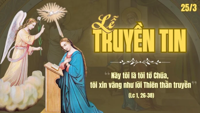 Khi ấy, thiên thần Gabriel được Chúa sai đến một thành xứ Galilêa, tên là Nadarét, đến với một trinh nữ đã đính hôn với một người tên là Giuse, thuộc chi họ Ðavít, trinh nữ ấy tên là Maria. Thiên thần vào nhà trinh nữ và chào rằng: “Kính chào Bà đầy ơn phước, Thiên Chúa ở cùng Bà, Bà được chúc phúc giữa các người phụ nữ”. Nghe lời đó, Bà bối rối và tự hỏi lời chào đó có ý nghĩa gì. Thiên thần liền thưa: “Maria đừng sợ, vì đã được nghĩa với Chúa. Này Bà sẽ thụ thai, sinh một Con trai và đặt tên là Giêsu. Người sẽ nên cao trọng và được gọi là Con Ðấng Tối Cao. Thiên Chúa sẽ ban cho Người ngôi báu Ðavít tổ phụ Người. Người sẽ cai trị đời đời trong nhà Giacóp, và triều đại Người sẽ vô tận”. Nhưng Maria thưa với thiên thần: “Việc đó xảy đến thế nào được, vì tôi không biết đến người nam?” Thiên thần thưa: “Chúa Thánh Thần sẽ đến với Bà và uy quyền Ðấng Tối Cao sẽ bao trùm Bà. Vì thế Ðấng Bà sinh ra, sẽ là Ðấng Thánh và được gọi là Con Thiên Chúa. Và này, Isave chị họ Bà cũng đã thụ thai con trai trong lúc tuổi già và nay đã mang thai được sáu tháng, người mà thiên hạ họi là son sẻ; vì không có việc gì mà Chúa không làm được”. Maria liền thưa: “Này tôi là tôi tớ Chúa, tôi xin vâng như lời Thiên thần truyền”. Và thiên thần cáo biệt Bà.