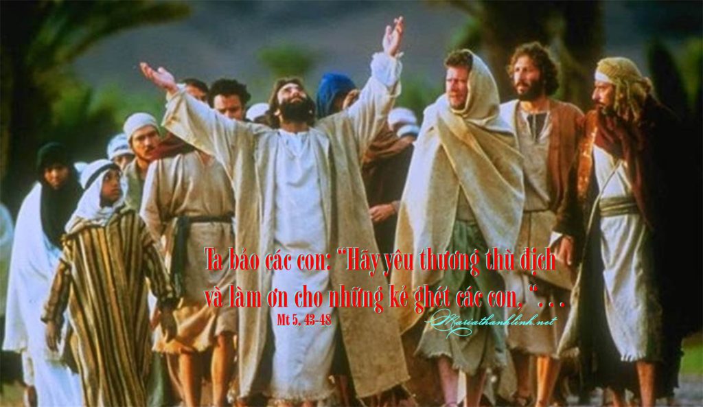 Khi ấy, Chúa phán cùng các môn đệ rằng: “Các con đã nghe dạy: ‘Ngươi hãy yêu thân nhân, và hãy thù ghét địch thù’. Còn Ta, Ta bảo các con: Hãy yêu thương thù địch và làm ơn cho những kẻ ghét các con, hãy cầu nguyện cho những ai bắt bớ và nguyền rủa các con: để như vậy các con nên con cái Cha các con, Đấng ngự trên trời: Người khiến mặt trời mọc lên cho người lành kẻ dữ, và cho mưa xuống trên người liêm khiết và kẻ bất lương. Vì nếu các con yêu thương những ai mến trọng các con, thì các con được công phúc gì? Các người thu thuế không làm thế ư? Nếu các con chỉ chào hỏi anh em các con thôi, thì các con đâu có làm chi hơn? Những người ngoại giáo không làm như thế ư? Vậy các con hãy nên hoàn hảo như Cha các con trên trời là Đấng hoàn hảo”.